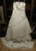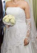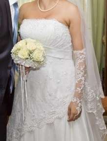 Свадебное платье 48-50-52 размера, на большую грудь, белого цвета, длинный шлейф, кружева ручной работы, немного бисера и пайеток, в хорошем состоянии: постирано, выглажено, очень удобное, не спадает, так как имеется специальная поддерживающая застежка, сзади на молнии. Платье привезено из за границы. Одето один раз. Также хорошо подойдет для тех, кто в положении. Без проблем подгоняется под фигуру. Торг. Митенки в подарок. В вибер могу скинуть дополнительные фото.