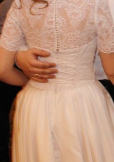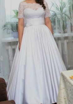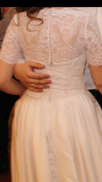 Продается свадебное платье от дизайнера Оксана Муха. Платье белого цвета, размер 44-46. Вверх - кружевное полотно, спинка украшена множеством жемчужных пуговичек, юбка - атлас. Надевалось 1 раз, не венчанное, сдавалось в химчистку. Торг уместен.